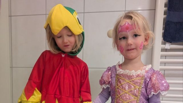 Bei der Fuchsgruppe ist die ganze Woche Fasching 🎉 Und heute war Kinderschminken 🙂 Hat sich Lara natürlich nicht entgehen lassen 😀 Morgen ist dann noch Big Party mit der Bienengruppe und Buffet und am Freitag ist Schlafanzugtag 😅